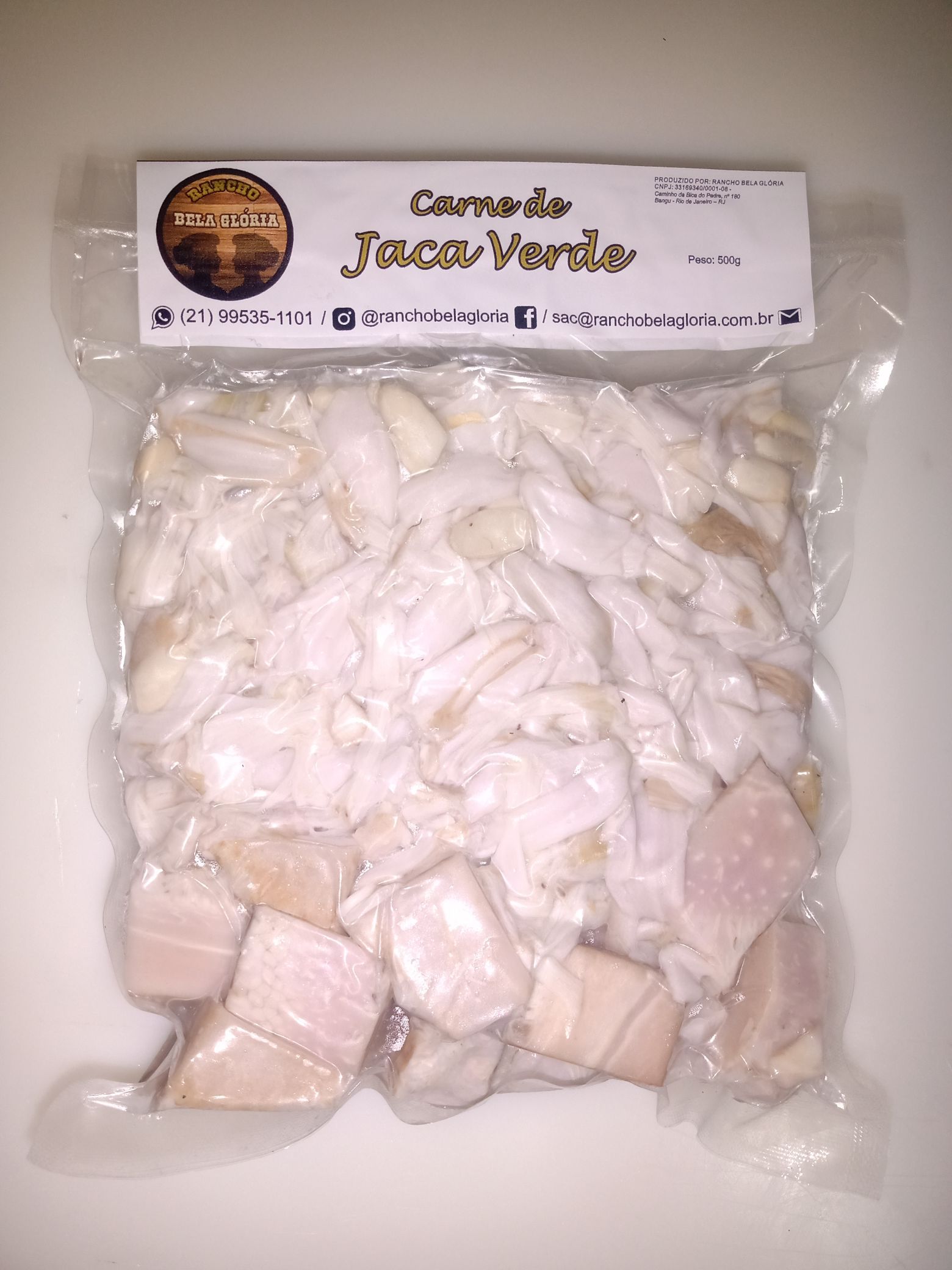 Carne da jaca verde, em pedaços, descascada, contendo gomos, fibra, palmito e as amendoas (sem pele). Embalagem de 500g, a vácuo, congelada.